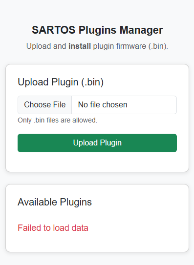Install plugin binaries (.bin) via the UI — the system validates signature and dependencies.